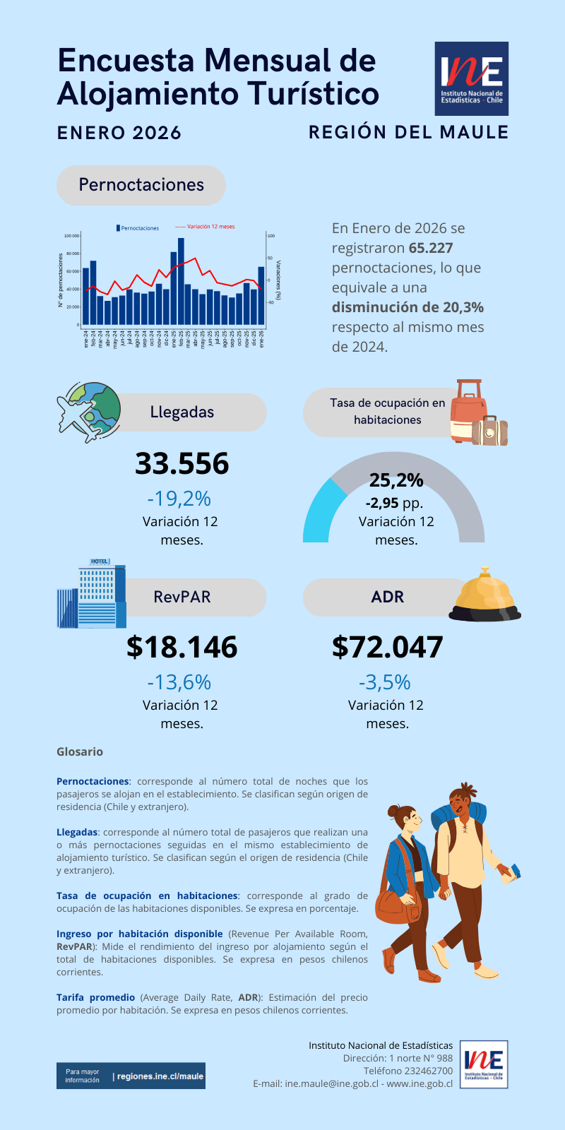 Las pernoctaciones de pasajeros en establecimientos de alojamiento turístico en la Región del Maule llegaron a 65.227 en enero de 2026, lo que implicó un descenso de 20,3%, respecto al mismo mes del año anterior.